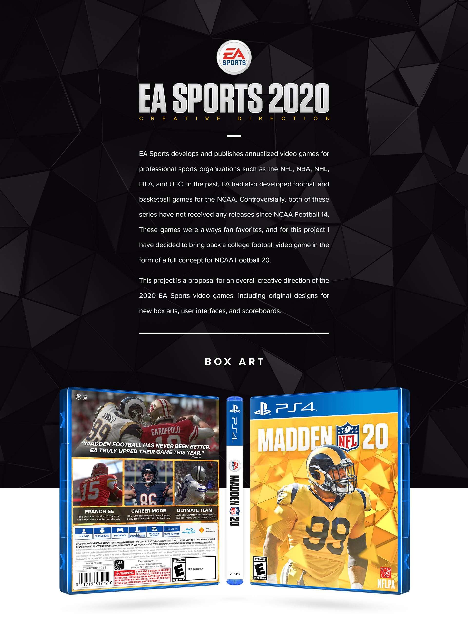 A concept for an overall creative direction for the 2020 EA Sports video games. Including box art, menus, and in-game scoreboards.